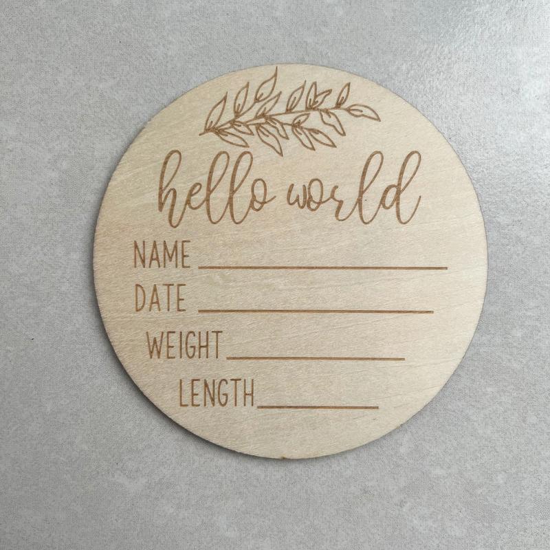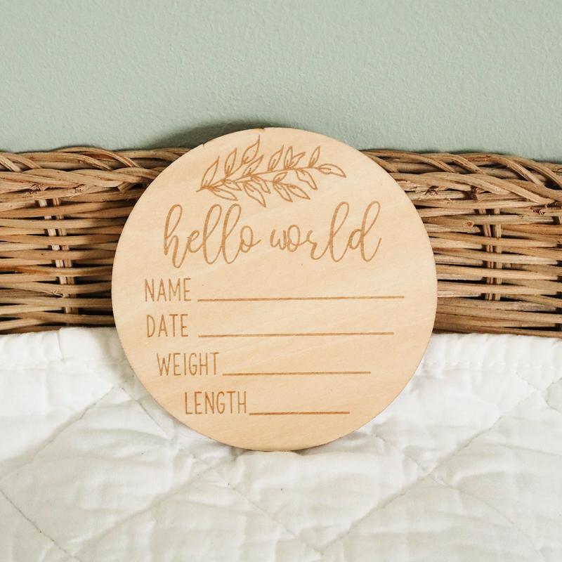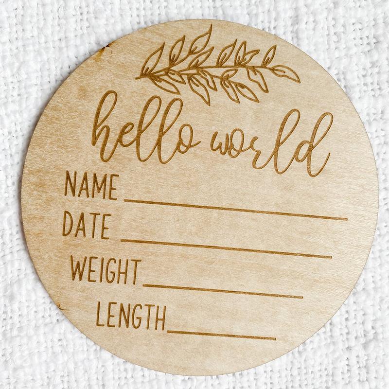 Hello World Baby Birth Announcement Plaque Wooden Disc Introducing Name Card