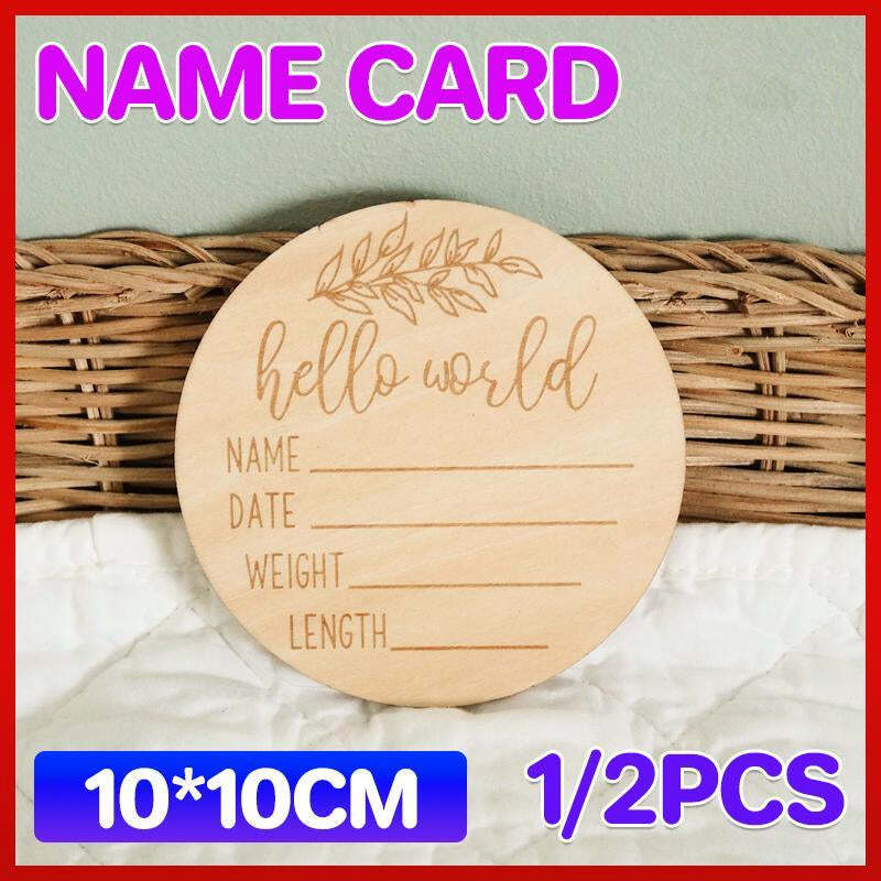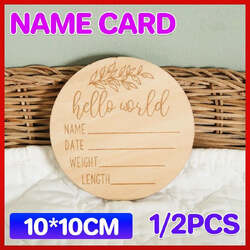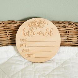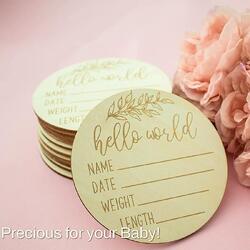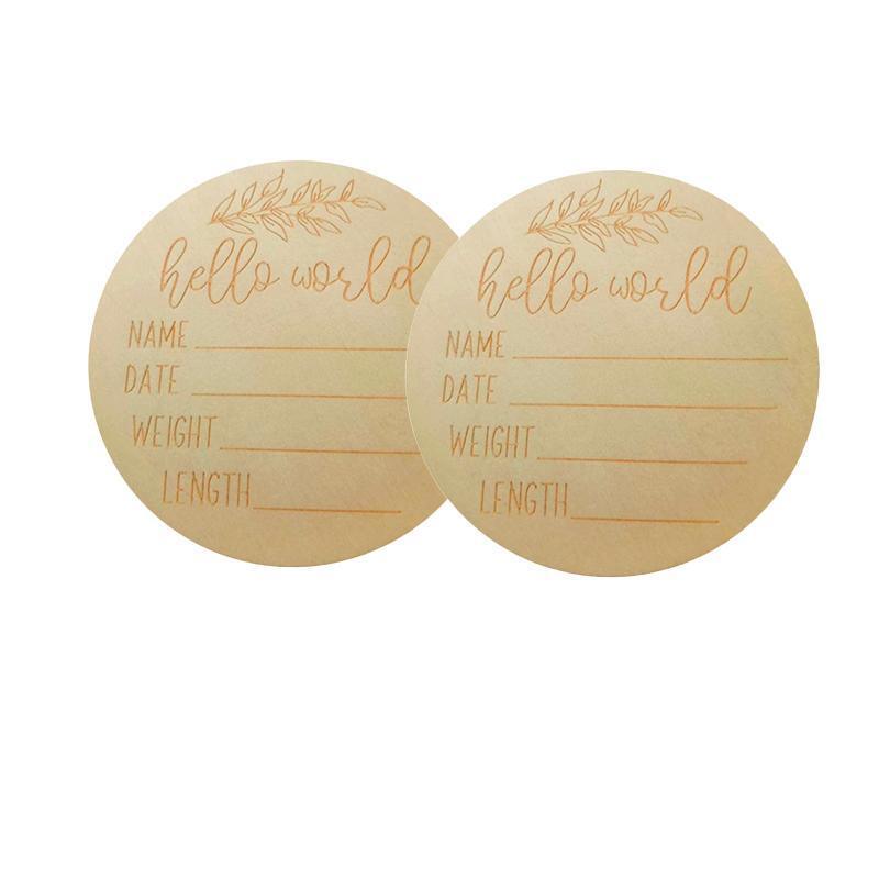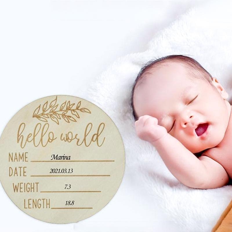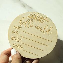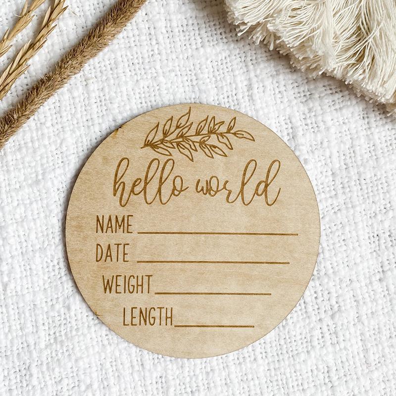Hello World Baby Birth Announcement Plaque Wooden Disc Introducing Name Card