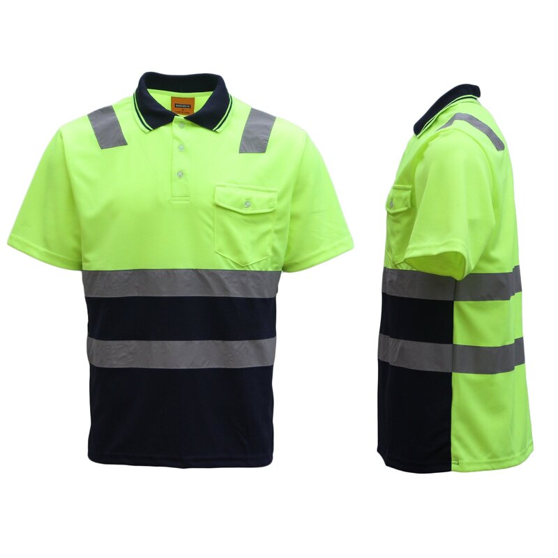 HI VIS Short Sleeve Workwear Shirt w Reflective Tape Cool Dry Safety Polo 2 Tone, Fluoro Yellow / Navy, 4XL