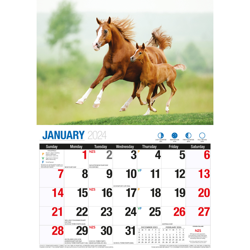- Public Holidays, pension dates, and school terms for Australia and New Zealand are marked on the calendar.
