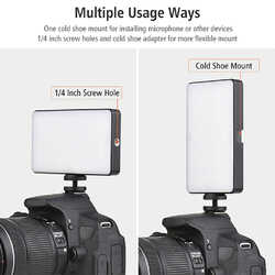 Multiple Usage Ways: With one cold shoe mount for installing microphone or other devices; 1/4 inch bottom & side threads, plus the provided cold shoe adapter, you can mount the LED light to a camera, tripod, or another bracket easily.