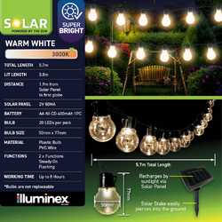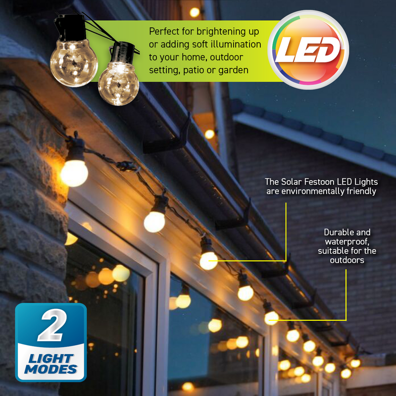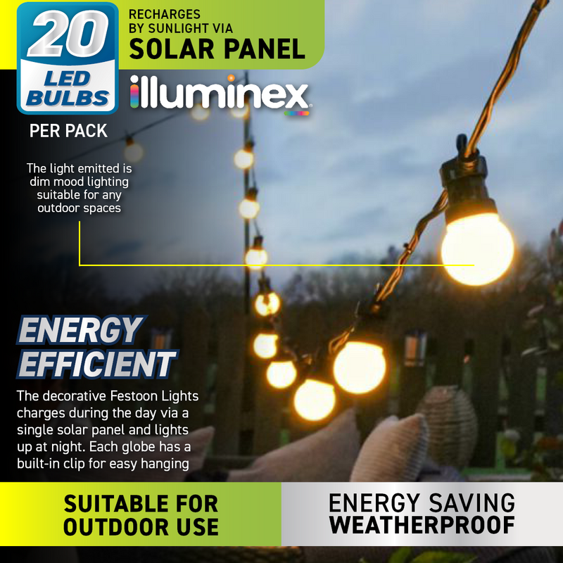 illuminex? Beautiful decorative solar festoon lights to add style and soft illumination to your outdoors. Each piece is fitted with 20 bulbs, include 2 light modes and are weatherproof.