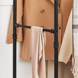 - This chic industrial-style clothes rack is the perfect addition to any home. Its trendy design will make a statement in any rustic apartment or feminine space. Not only can it show off your beautiful clothing, but it can also expand storage in a bedroom or laundry. This clothes rack is a must-have for any retail store or secondary market.