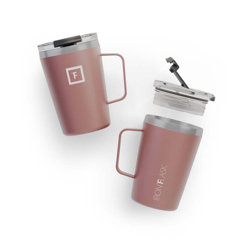 Iron Flask Grip Coffee Mug, Rose Gold, 12oz/350ml. Let Iron Flask help you get a grip. Our 12 oz Grip Coffee Mug gives you two hours of piping hot tea or magic bean juice in a double-wall-insulated stainless steel coffee mug. Each grip mug is powder-coated in a variety of colors and is 100% leak-proof, so you can drink your java in style without worrying about a coffee-stained wardrobe.