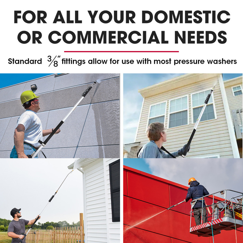 The Jet-USA 18' Telescopic Pressure Washer Attachment is a must have for anyone, tradesmen; commercial operator; handyman or DIY'er for all of the hard to get at cleaning jobs, in the garden and at work. With a working reach of 5 ½ metres this tool makes getting to gutters, high walls, windows and eaves a breeze. Clean layers of dirt and grime from trucks, boats, buildings or even remove paint or a problematic wasp or hornet's nests from a safe distance.