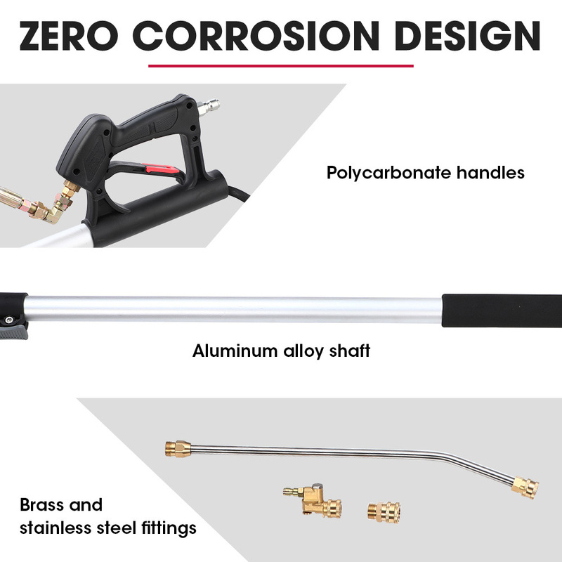 The 18' wand attachment is made from aircraft quality aluminium with tough nylon clamps for adjusting it to just the right length. It has a foam rubber padded lance and a body harness to make the telescoping lance easy to handle when extended to its full length. The trigger handle allows the changing of accessories without the need to go back to your pressure washer to turn it off. The wand is also equipped with heavy-duty brass and stainless steel quick connect fittings.
