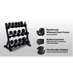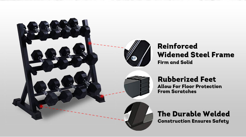 - MULTI-LEVEL STORAGE FOR FREE WEIGHTS - Store your dumbbells in a designated space that you can easily access while keeping things organized in your home gym! This rack stand features a 3-tiered storage space designed to accommodate dumbbells of all sizes.