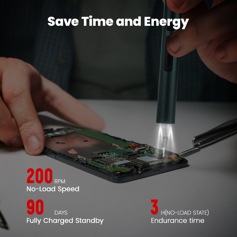 350mAh Battery: Equipped with a 350mAh lithium-ion battery, which allows the electric screwdriver to have a 3-hour endurance time (no-load state) and 90 days fully charged standby.