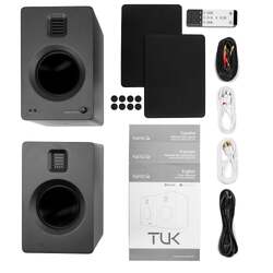 Kanto TUK 260W Powered Bookshelf Speakers with Headphone Out, USB Input, Dedicated Phono Pre-amp, Bluetooth - Pair, Matte Black - Delivering clarity and performance that put it in a class of its own, TUK is designed to push the limits on what a bookshelf speaker can achieve. Fine-tuned with onboard DSP, its high-performance AMT tweeters and 5.25??aluminium drivers produce sparkling highs and rich bass, bringing life to all your source material. Its active crossover further improves low-end resolution by filtering out sub-80Hz frequencies when connected to a subwoofer. Outfitted with dedicated phono, RCA and Optical TOSLINK inputs, a built-in USB DAC and headphone amp, and Bluetooth 4.2 with aptX HD and AAC codecs, TUK provides the flexibility you need to enjoy all your devices.