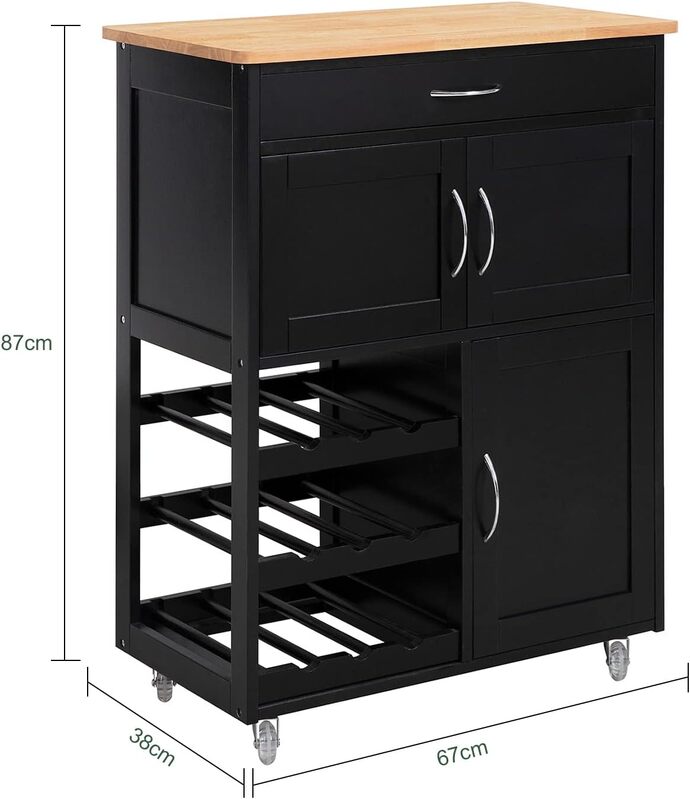 - This stylish and functional 3-tier wine bottle rack is the perfect addition to any home. It features one drawer and two cupboards, and is mounted on four swivel castor wheels (two of which are braked) for easy mobility. Enjoy the convenience of having your favorite wines and glasses stored in one place, and the added bonus of being able to move it around your home as needed.