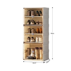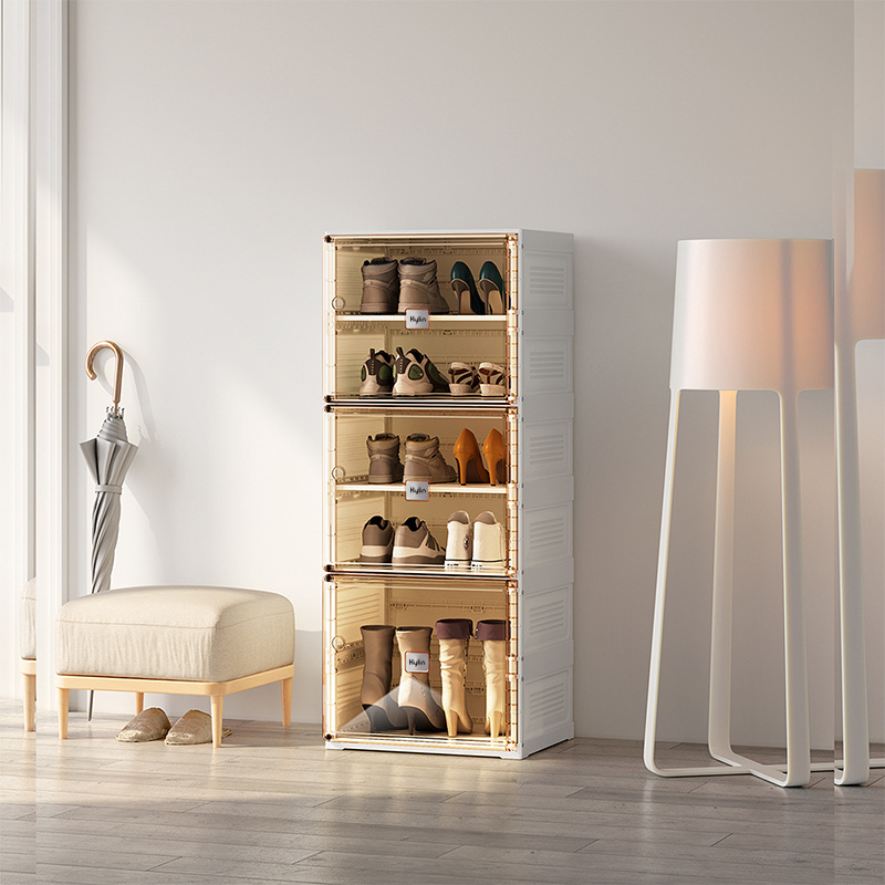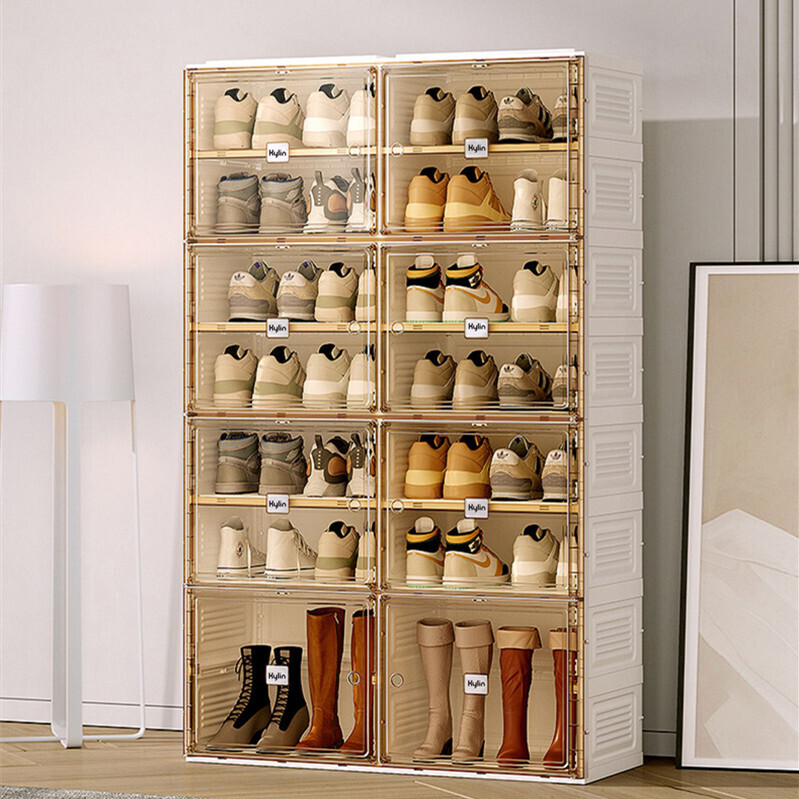 Adopt mortise and tenon design and add precision steel screws, stable and not wobbly. Shelf level load-bearing, up to 150kg, the top of the shoe storage box can also store. Double lattice door panel??arge space and large capacity, building block-stacking, card slot in the middle, top and bottom splicing type, Free combination and stacking??ully meet the needs of placing all kinds of shoes. All-match home furnishing, suitable for small spaces.