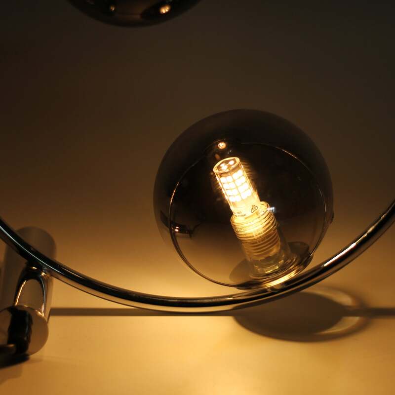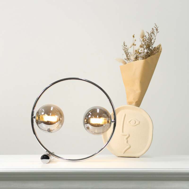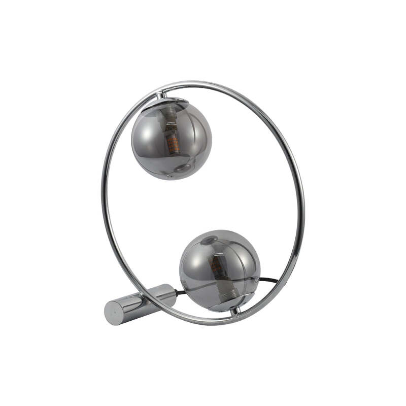 The Larique Table Lamp is a stunning chrome lighting piece that is artistically designed with style. The spectacular round metal frame is balanced with a short horizontal support rod that adds to the aesthetic of the lamp, while the two sphere glass shades finish it off to perfection.