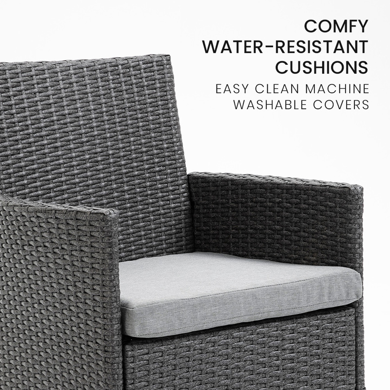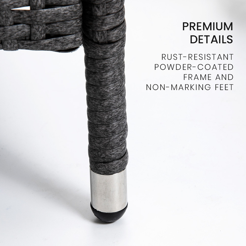 The London Rattan outdoor furniture setting has a durable, rust-resistant powder-coated steel frame and non-marking feet, ensuring no scuffs or rust stains on your outdoor living area.