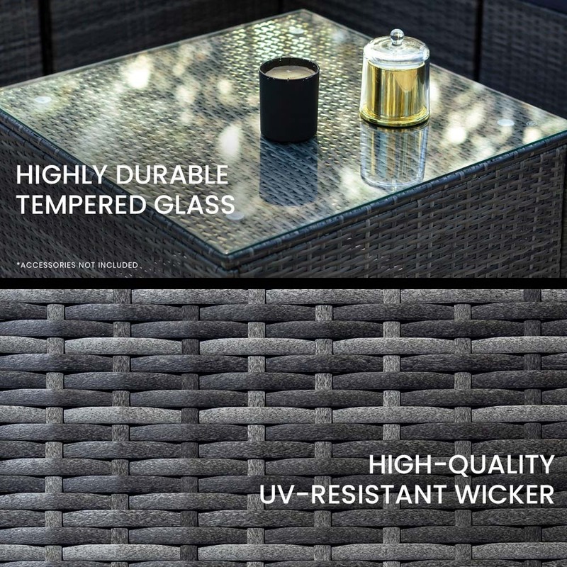 The set includes ultra-comfy 8cm thick water-resistant seat cushions, generous backrest cushioning and 2 premium throw cushions. The high-quality UV-resistant handwoven Suntech wicker in Marl Grey weave has a premium natural textured look. This is a modular design comprising one sofa, two corner sofas, an ottoman, plus a coffee table with tempered glass table top. You can set it up in whatever configuration works best for you, making this London Rattan outdoor lounge setting a great addition to any outdoor space.