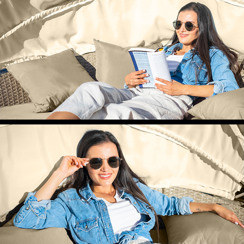 LONDON RATTAN 4pc Day Bed Round Lounge Outdoor Furniture, Beige Wicker and Canopy