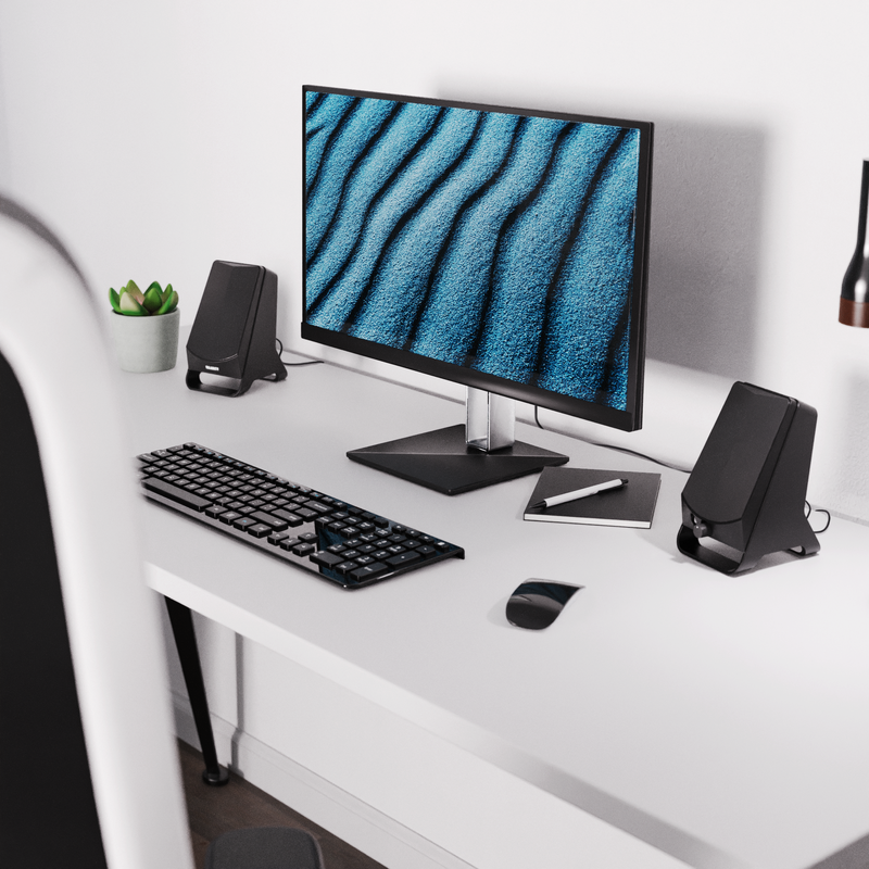 The DX10 computer speakers are perfect for enhancing your desktop setup. Simply plug them in for an immediate improvement in sound. These compact speakers are compatible with both Mac and PC and deliver clear stereo audio for various purposes, including music, videos, and gaming.