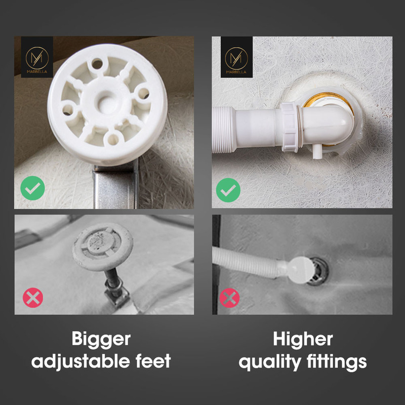 Designed in accordance with the Watermark Australian plumbing standard it comes complete with an approved chrome popup waste and extendable drainage hose. Marbella bath tubs are shipped in premium reinforced packaging with handles.The Aristo features large adjustable feet for simple and stable installation.