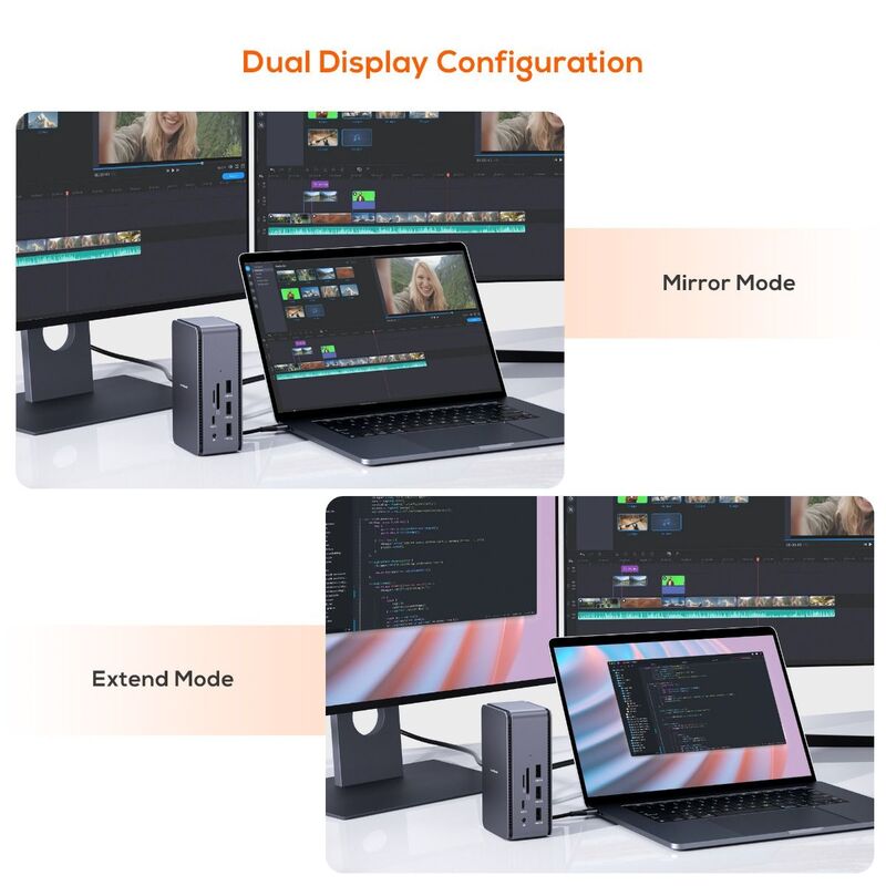 Built-in HDMI 2.1 and DisplayPort 1.4, achieve crystal clear 8K resolution with compatible devices*. Easily achieve 4K dual screen; Window™ supports MST or SST Mode 4K@60Hz*; Mac™ OS supports SST Mode 4K@60Hz. (*USB-C host must support DisplayPort 1.4)