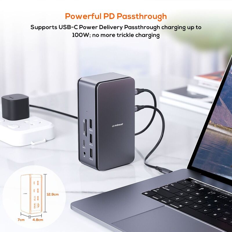 Featuring dual display via HDMI 2.1 and DP1.4, 100W PD pass-through, RJ45 1000Mbps, SD/MicroSD reader, 3xUSB3.2 with BC1.2 fast charge, 3xUSB2.0, 1xType-C and Hi-Res 3.5 AUX.