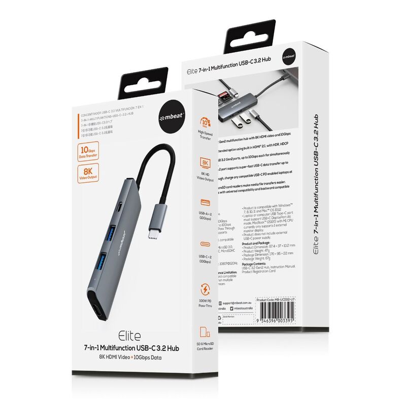 mbeat 7-in-1 USB-C 3.2 Gen2 Hub with 8K Video, 10Gbps Data - Space Grey