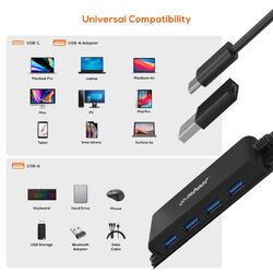 - 4-Port USB-C to USB 3.0 high-speed data hub for instant port expansion.