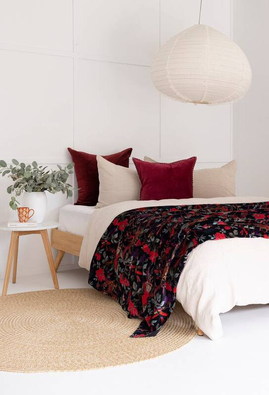 This soft plush velvet throw reverses to equally soft cotton fabric. The light weight throw is precisely made giving each throw a unique texture and tonal look. Reverses to plain cotton fabric at the back. Each throw is pre-washed for a natural and soft look. This cozy cotton velvet throw can be used as a bedspread, coverlet or blanket all year long.