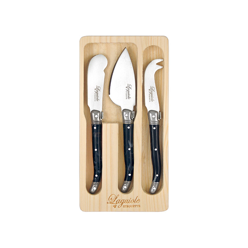 Forming part of the Laguiole Etiquette range is the Mini 3-piece Marble Black Cheese set packaged in the Traditional Laguiole pine box. This colourful set contains 1 x mini cheese knife, 1 x mini soft cheese knife and 1 x pate knife.