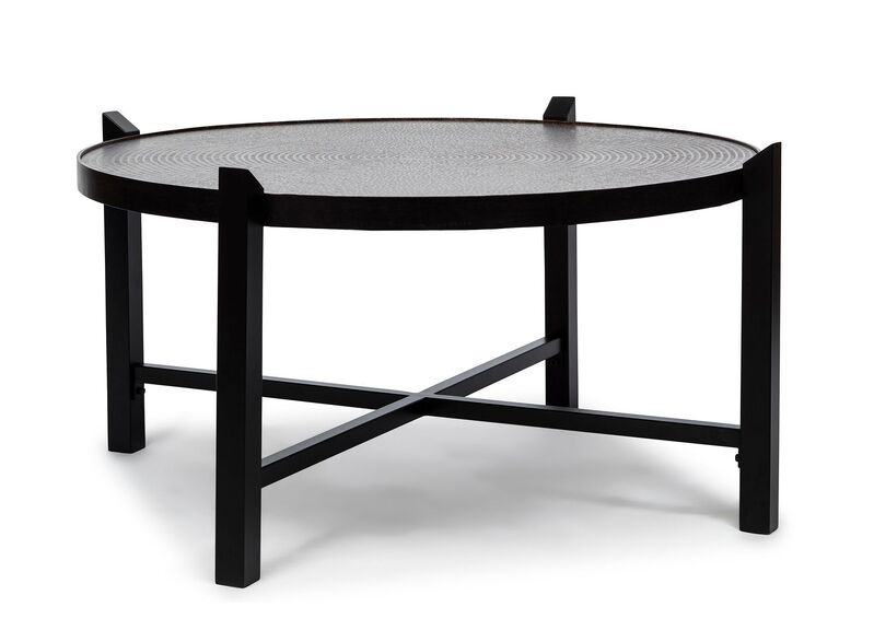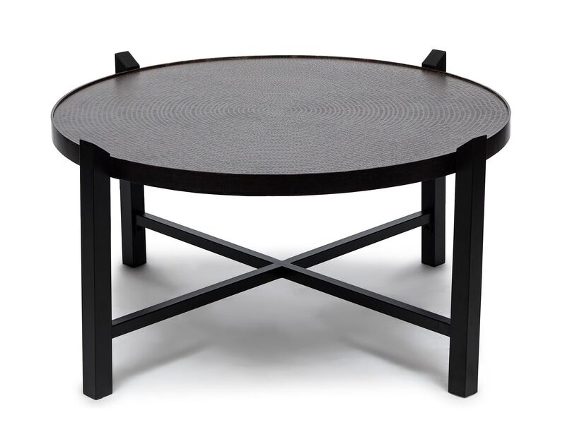 Modern Black Round Coffee Table with Copper Finish Engraved Top