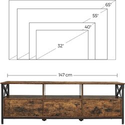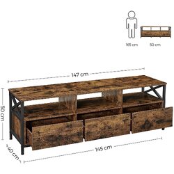 - This TV cabinet is the perfect combination of space-saving and storage. Measuring 147 x 40 cm, it is designed to fit TVs up to 65 inches, while also providing plenty of room to keep your DVDs, books, and other accessories organized. With 3 open shelves and 3 spacious drawers, you'll have plenty of room to store all of your items.
