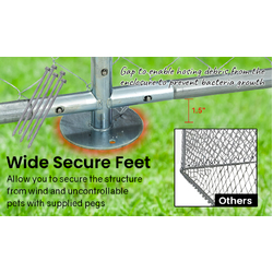 The cage has large feet which can be secured to the ground with the supplied stakes, which is necessary for larger energetic pets, and for stability in heavy wind. The feet also has the added benefit of raising the frame 1.5??off the ground which ensures that debris and harmful bacteria doesn?? build up against the frame.