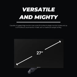 - Capable of supporting monitor sizes up to 34 inches in single monitor mode and up to 27 inches in dual monitor mode, with a maximum weight of 9kg. The SAGITTA PRO DUO also comes with both 75mm x 75mm and 100mm x 100mm mounting options, ensuring compatibility with most monitor mounts.