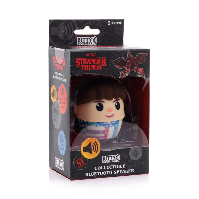 Netflix: Stranger Things Bitty Boomers Eleven Season 4 Ultra-Portable Collectible Bluetooth Speaker Bitty Boomers are ultra-portable, beyond adorable, wireless Bluetooth speakers. Finally a collectable with a purpose. Don?? be fooled though, what they lack in size, they make up for with clear, powerful, room-filling sound. Tiny Size. Huge Sound. The ultimate Audio Collectable, Bitty Boomers are packed with the latest Bluetooth technology offering a 30 ft range and over 4 hours of playing time on a single charge. Pair 2 Bitty Boomers together for mind-blowing stereo sound. At just under 2" Bitty Boomers can easily be carried in a pocket, strapped to a backpack or gym bag. Unlike other collectables that just collect dust, Bitty Boomers allow you to take your FANDOM wherever you go.