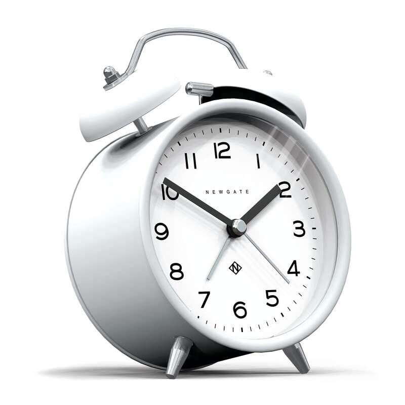 Newgate Charlie Bell Echo Matte Pebble White A modern white alarm clock with a contemporary graphic dial and a moving hammer and twin-bell alarm.