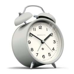 Newgate Charlie Bell Echo Matte Posh Grey A modern grey alarm clock with a contemporary graphic dial and a moving hammer and twin-bell alarm.