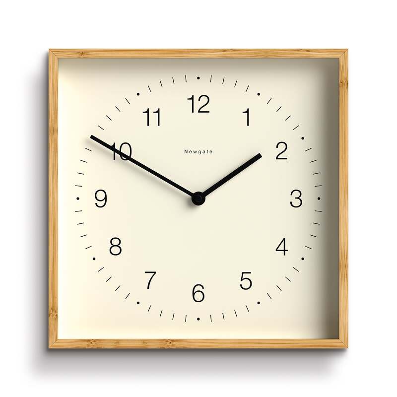 This medium wall clock creates a modern focal point in the kitchen, living room or office. Bamboo clock with metal hands and a glass lens.