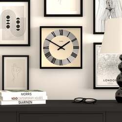 A square wall clock with a circular Roman dial printed on a silver disk. This is complimented, by triangulation hands, a straight cut Matt Black case and glass lens.