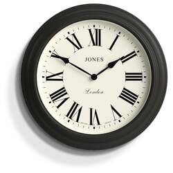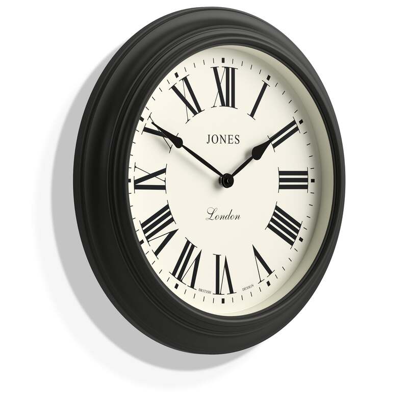 A classic grey Roman numeral wall clock. The decorative moulded case is finished in matte 'Charcoal Grey' with black metal spade hands and a flat glass lens.