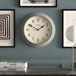 A classic grey Arabic numeral wall clock. The decorative moulded case is finished in matt 'Cloud Grey' with black metal spade hands and a flat glass lens.