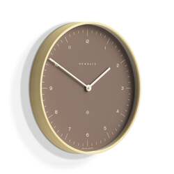 A modern Scandinavian-inspired wall clock with a pale plywood case and a contemporary ??urnt Sienna??dial with minimalist graphic numerals.