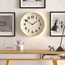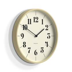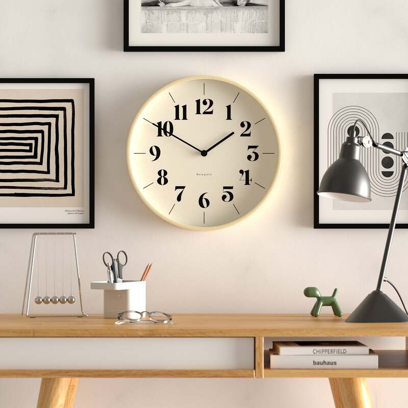 A modern wall clock with a pale plywood case and a contemporary theatre dial.