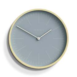 A modern Scandinavian-inspired wall clock with a pale plywood case and a contemporary ??ill Blue??face with a minimalist marker dial.