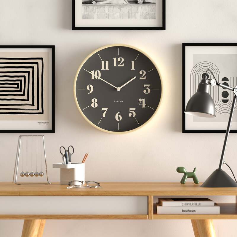 A modern wall clock with a pale plywood case and a contemporary reverse theatre dial.