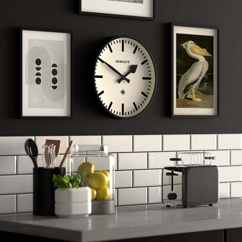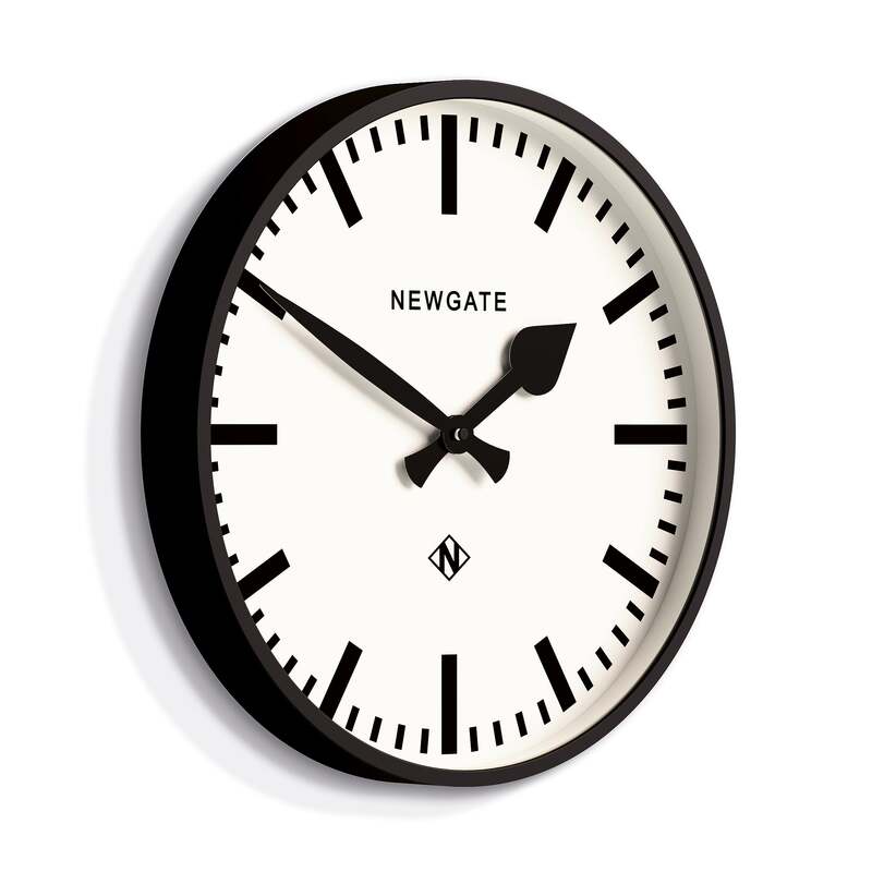 Newgate Railway Clock Black A matt black station wall clock with a bold marker dial, black spade and batton hands and a minimalist straight-cut case. This bold wall clock is the ideal way to brighten up a room, whether that's the kitchen, living room or office.