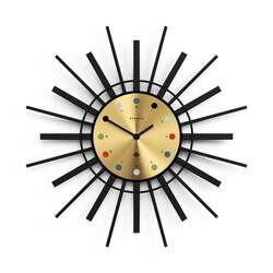 A retro style sunburst wall clock with matt black sunrays and a contemporary Arabic and dot spun brass effect dial and straight metal hands.