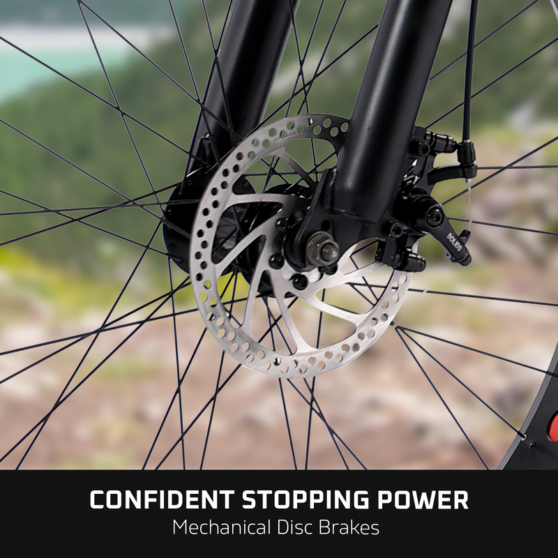 - The powerful brake system includes an adjustable steel suspension fork to effectively absorb shocks on rough terrain. The double disc brake gives you stable and strong braking force to help keep the cyclist safe on steep roads.