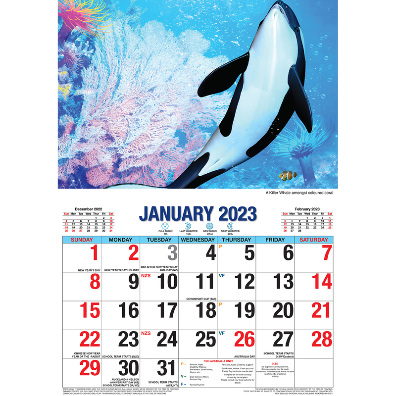 - Public Holidays, pension dates, and school terms for Australia and New Zealand are marked on the calendar.