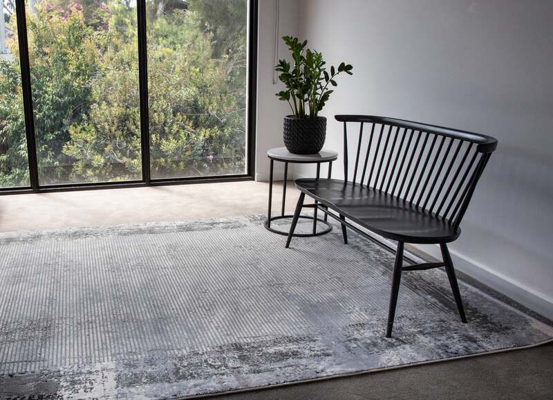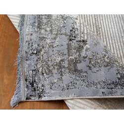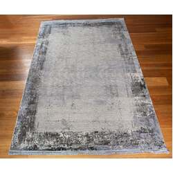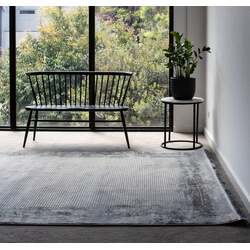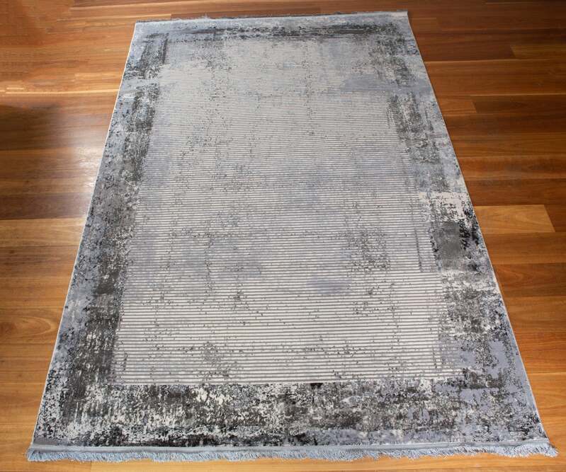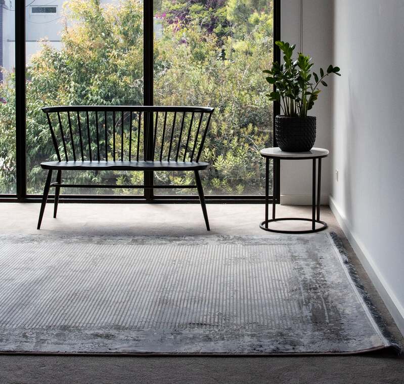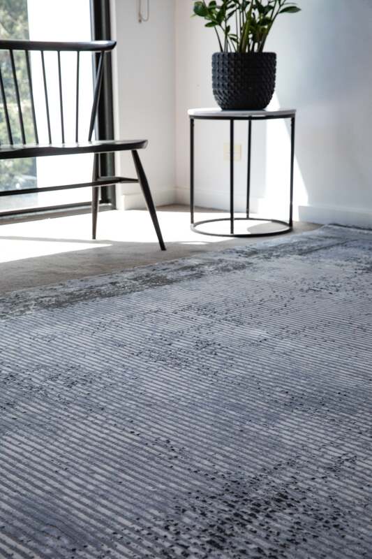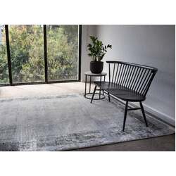 An elegant abstract style rug with a grayscale theme. The predominantly white central region is teased by spatters of greys, and this spacious area is bordered by faint strokes of black that define a soft fading edge, preserving a feeling of elegance with the boldly contrasting colours. This design is a tasteful touch to a modern or classic home environment.