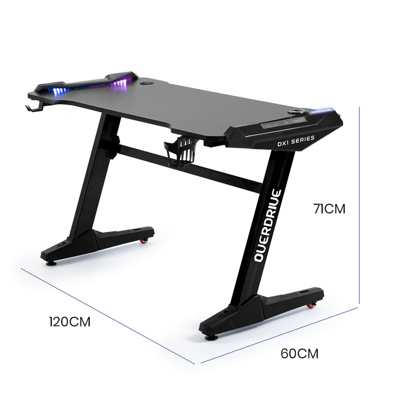 OVERDRIVE Gaming Desk, 120x60cm, Carbon Fiber Styling, LED Lights, Headset Hanger, Cup Holder, Cable Management, Black