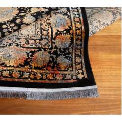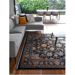 A luxurious semi-traditional design Persian rug fit for a palace, but nonetheless a welcome grace to any home environment. This design is literally the peak of outstanding, with the bright gold and colourful flowers popping from a black background, almost like dream-like stars in the night sky; a bold but captivating piece. Despite being machine-made, Pandora retains an authentic hand-made look.