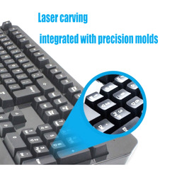 The mouse has 4 buttons and interchanging DPIs, and the full-sized keyboard has 104 keys.